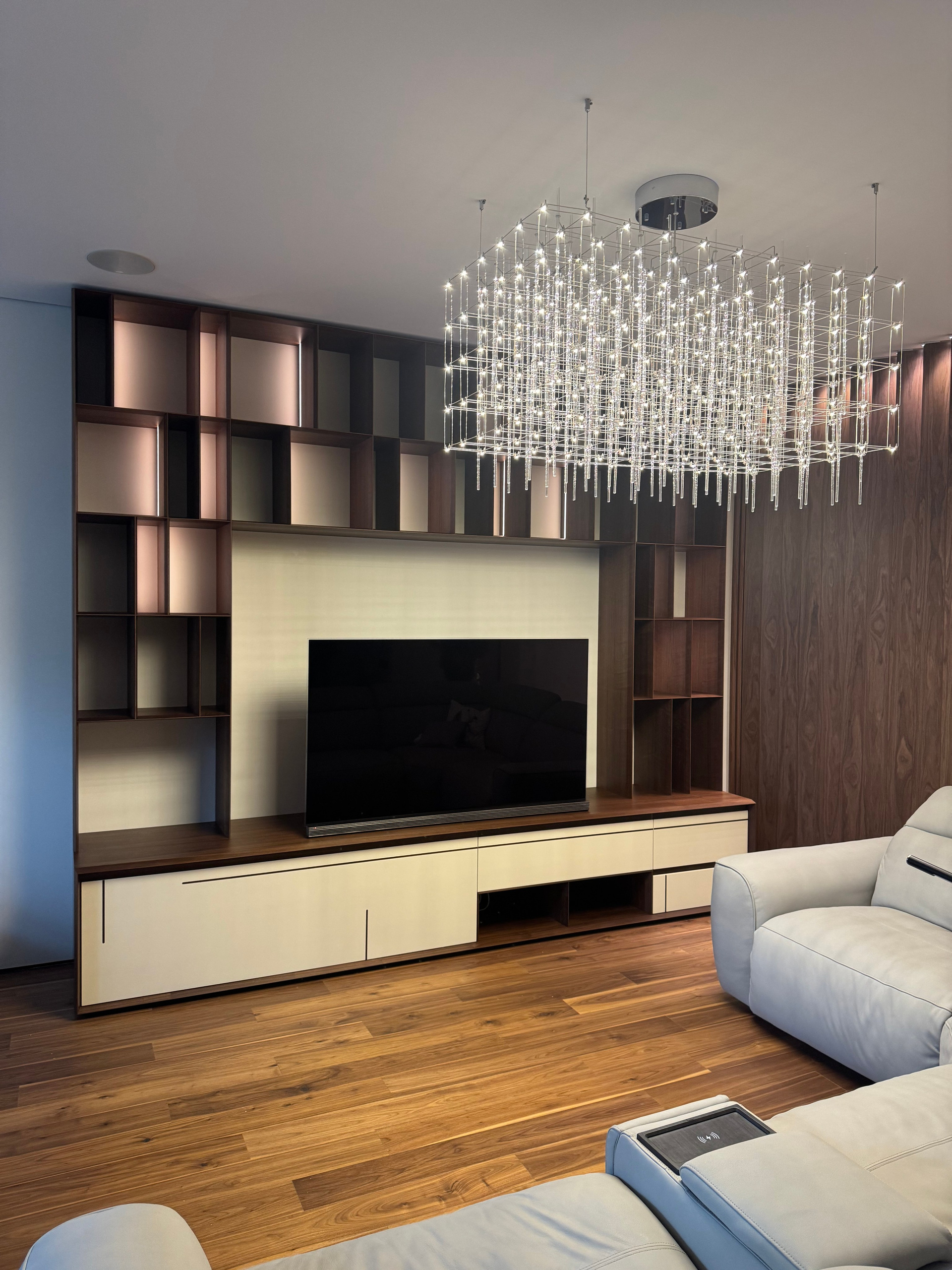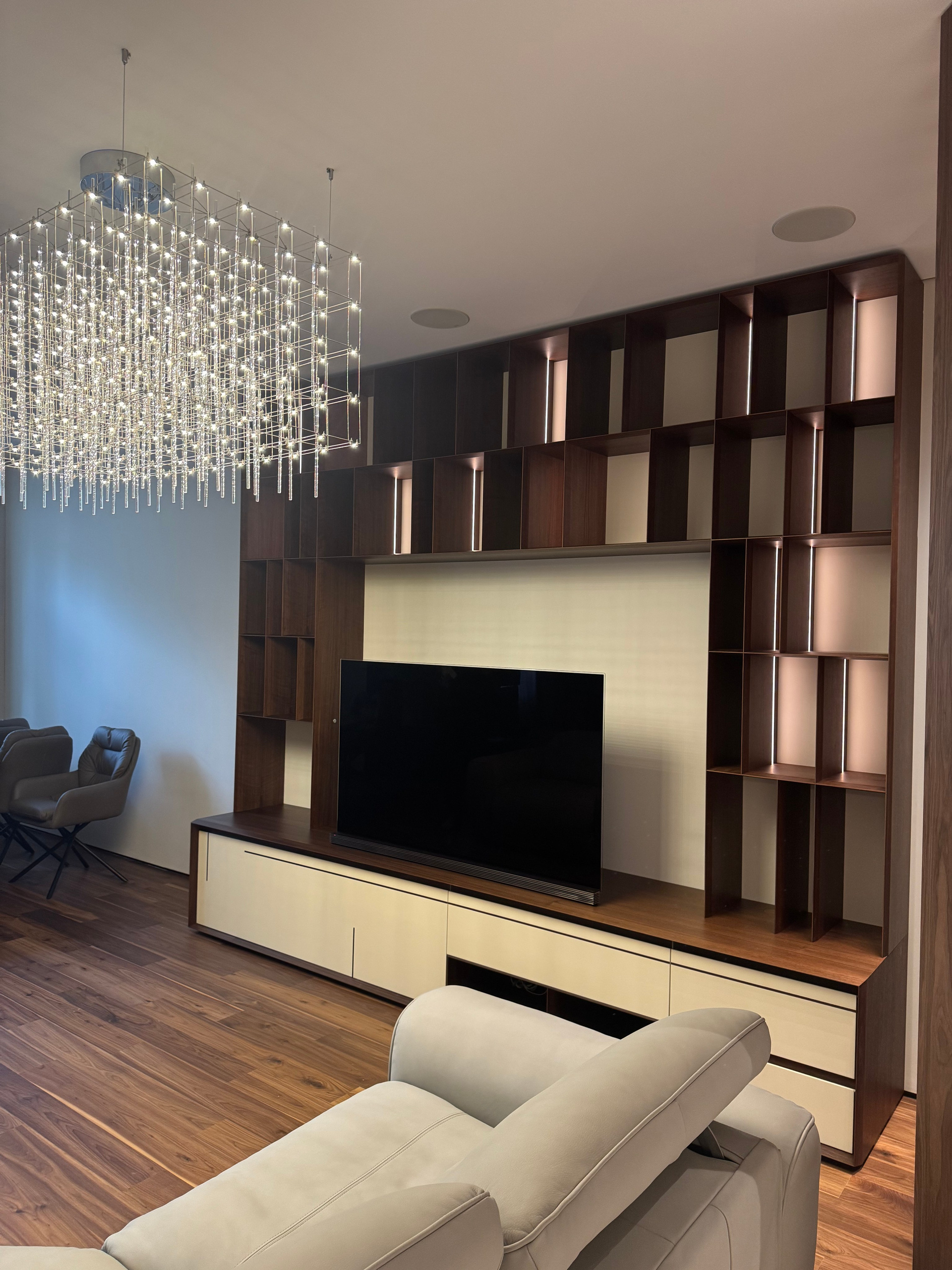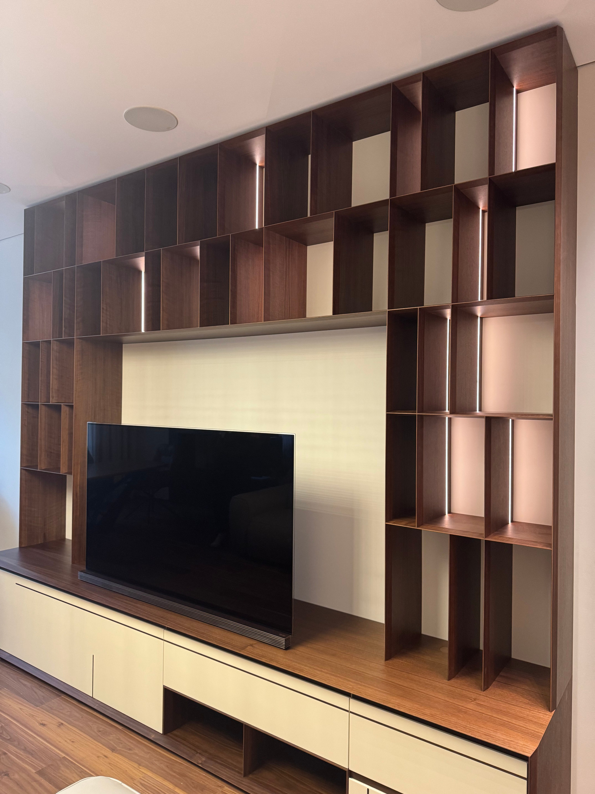 К нам обратился заказчик с запросом, знакомым многим: «Хочу как у известного бренда, но в реальном бюджете». Для нас это стало не просто коммерческим заказом, а настоящим вызовом — доказать, что качественное исполнение сложных дизайнерских решений возможно без заоблачных ценников. Техническая задача: Создать стеллаж, где каждая деталь выглядит невесомой и изящной. Ключевые требования казались почти невыполнимыми:• Полное отсутствие видимого крепежа• Симметричные запилы торцов с толщиной видимой кромки всего 3 мм• Визуальная легкость при сохранении конструктивной прочности. Наше решение: Мы не просто скопировали оригинал — мы его переосмыслили и улучшили. Для достижения требуемой легкости заказали специальную облегченную фанеру из-за рубежа. Тщательно подобрали шпон, который идеально сочетался бы с общей концепцией. Процесс изготовления: Это была работа ювелирной точности. Бесконечная настройка углов запилов, разработка специальных пресс-форм для склейки тонкостенных элементов, поиск оптимальных способов скрытой сборки. Каждый миллиметр имел значение — при толщине торца в 3 мм погрешности недопустимы. Результат превзошел ожидания: стеллаж, который визуально не уступает именитому прототипу, но при этом доступен по цене и в чем-то даже превосходит оригинал по качеству исполнения.